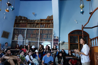 Next we visited the Abuhav Synagogue, a Sephardic shul which houses the oldest Torah scroll in Tsfat (almost 600 years old). The colorful decorations on the wall including the bright blue bimah (which is the trademark color of Tsfat) gave us a lot to look at.